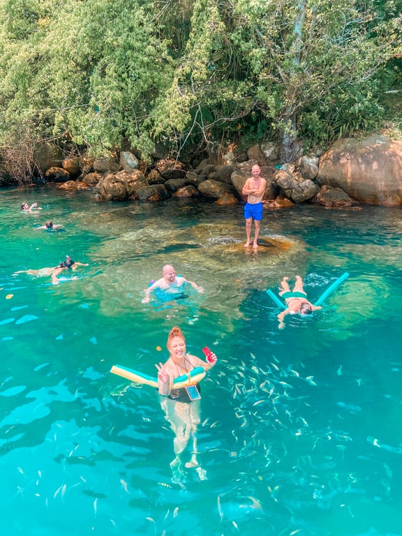 ✅ O que está incluso? Cooler com gelo para levar suas bebidas, água mineral, snorkel, flutuante e colete salva-vidas